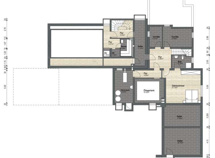 Das Untergeschoss vereint praktische Funktionalität mit zusätzlichen Wohnbereichen. Neben der Heizungsanlage und großzügigen Abstellräumen bietet es eine separate Sauna mit Tauchbecken sowie ein weiteres Schlafzimmer mit eigenem Bad – optimal für Gäste oder als privates Refugium.