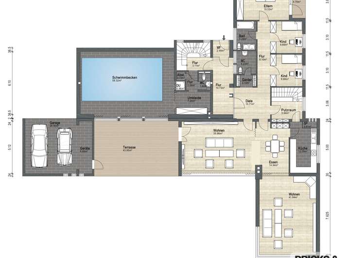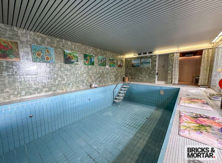 Das Erdgeschoss besticht durch zwei geräumige Schlafzimmer sowie einen offenen Wohn- und Essbereich, der mit einem stilvollen Kaminofen eine gemütliche und zugleich elegante Atmosphäre schafft. Ein besonderes Highlight ist der beheizte Innenpool mit separatem Dusch- und WC-Bereich – ideal für Wellnessmomente in den eigenen vier Wänden. Die angrenzende, überdachte Terrasse lädt zum Entspannen ein und kann bei Bedarf dank elektrischer Rollläden verschattet werden. Ein weiteres praktisches Detail: Sie gelangen von der Garage über die überdachte und abschließbare Terrasse direkt ins Haus, sodass Sie auch bei schlechtem Wetter trockenen Fußes nach Hause kommen.