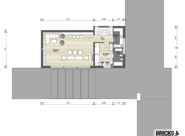 Das Obergeschoss bietet eine nahezu autarke Wohneinheit. Das weitläufige Wohnzimmer gewährt einen traumhaften Ausblick über Baunatal und die Umgebung. Eine voll ausgestattete Küche, ein stilvolles Schlafzimmer sowie ein modernes Badezimmer sorgen für höchsten Wohnkomfort – ideal als privater Rückzugsort oder Gästebereich.