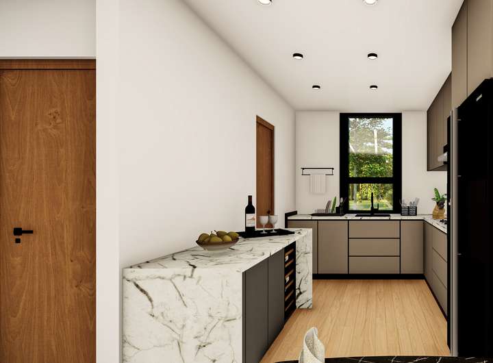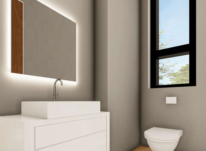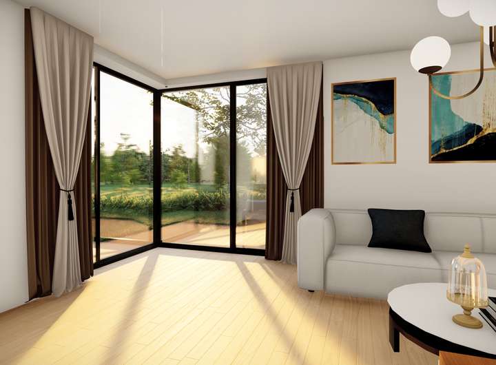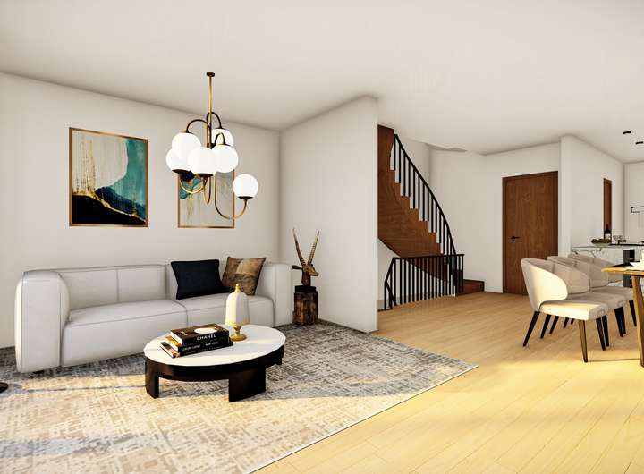 Bereits im Erdgeschoss öffnet sich der Eingangsbereich zu einem großzügigen, lichtdurchfluteten Wohn- und Essbereich. Die weitläufige Fensterfront sorgt für ein angenehmes Raumgefühl und ermöglicht gleichzeitig den direkten Zugang zum Garten. Die offene Küche fügt sich harmonisch in diesen Wohnbereich ein und schafft einen modernen Mittelpunkt des täglichen Lebens. Ein Gäste-WC komplettiert diese Ebene und sorgt für zusätzlichen Komfort im Alltag.