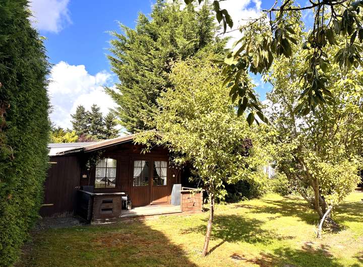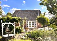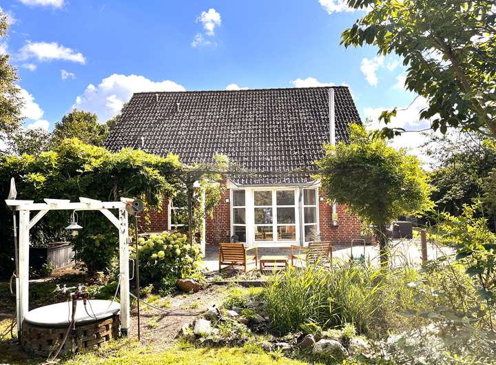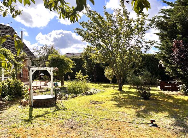 Das Herzstück ist das ca. 30 m² große Wohnzimmer mit Kaminofen mit bodentiefen Fenstern von zwei Seiten. Von hier öffnet sich der Blick in den traumhaften Garten mit altem Baumbestand, Rasenfläche, Teich und Gartenhaus. Vor dem Wohnzimmer liegt eine Süd-Westterrasse, die auf der Westseite überdacht ist. Auch von der Küche gibt es einen Zugang zur Terrasse. Insgesamt gibt es 4 helle Schlafzimmer sowie ein modernes Duschbad im Erdgeschoss und ein großzügiges Wannenbad im Obergeschoss.