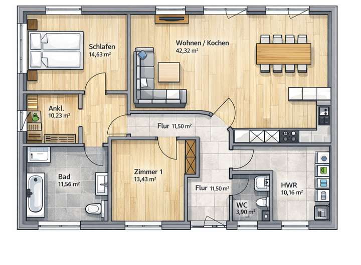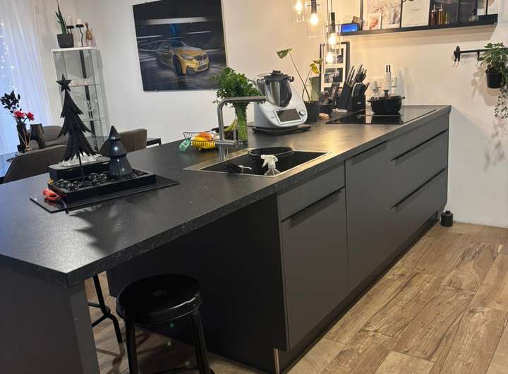Die hochwertig ausgestattete Küche fügt sich elegant in den Wohnbereich ein und wird schnell zum Treffpunkt des Hauses. Der Wohnbereich selbst bietet viel Platz für individuelle Gestaltung und überzeugt durch seine Großzügigkeit.