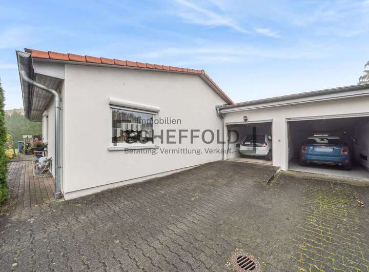 Für Ihre Fahrzeuge stehen zwei Einzelgaragen bereit, ergänzt durch zwei davorliegende Außenstellplätze.