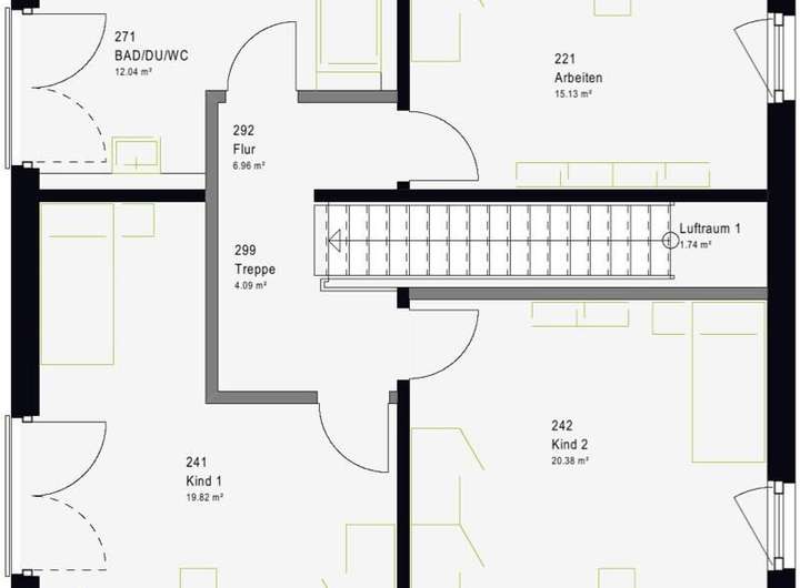 Unter dem modernen Flachdach gruppieren sich im Obergeschoss das Arbeitszimmer, Kinderzimmer 🧒 und Badezimmer 🛁 harmonisch um den zentralen Treppenaufgang - ein durchdachtes Konzept, das Klarheit, Stil und Wohnkomfort perfekt vereint.