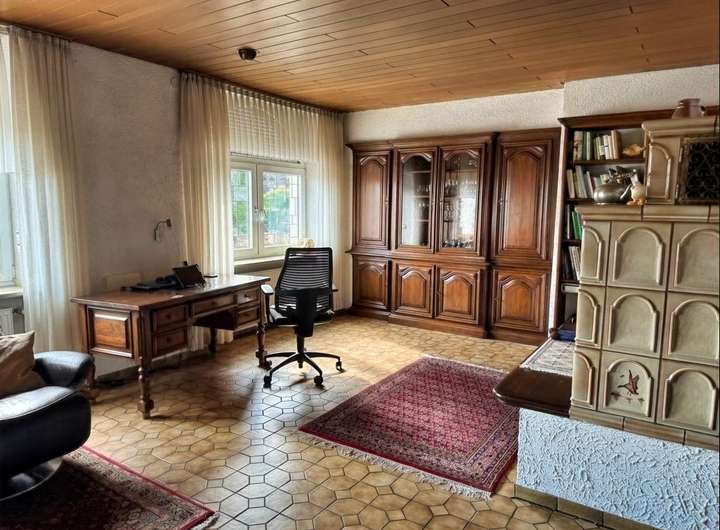EG: Hausflur - Gäste-WC - Küche mit Zugang Balkon und Garten - Esszimmer - Wohnzimmer mit Kachelofen