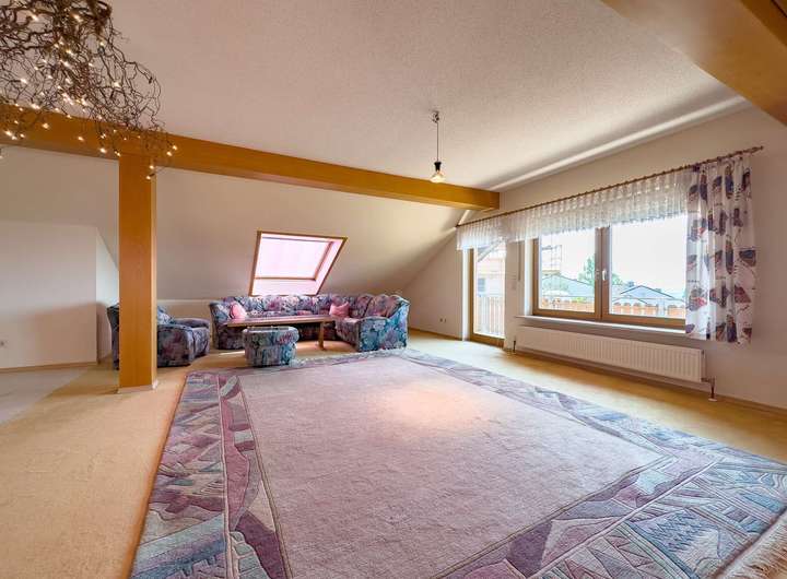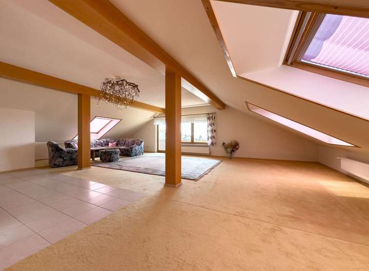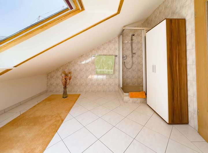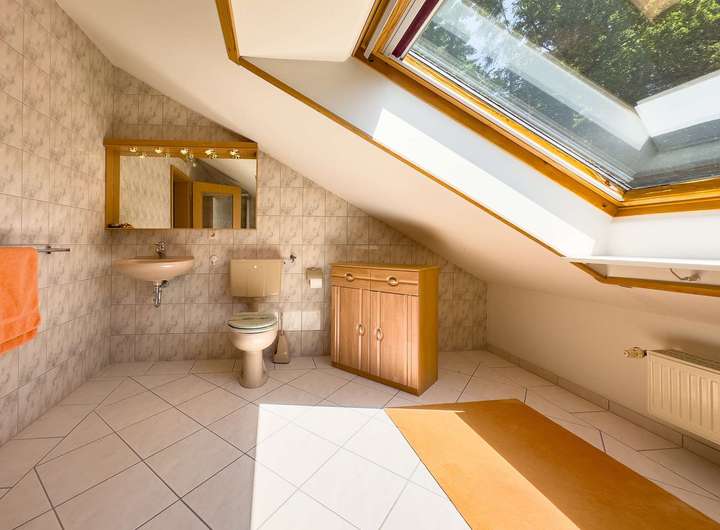 Im Dachgeschoss wurde eine weitere Wohnung mit ca. 80 m² Wohnfläche (ca. 160 m² Nutzfläche) geschaffen. Sie bietet ein helles, gemütliches Ambiente, ein separates Schlafzimmer, ein Tageslichtbad und einen Balkon mit Weitblick – perfekt als Singlewohnung oder Ferienvermietung.