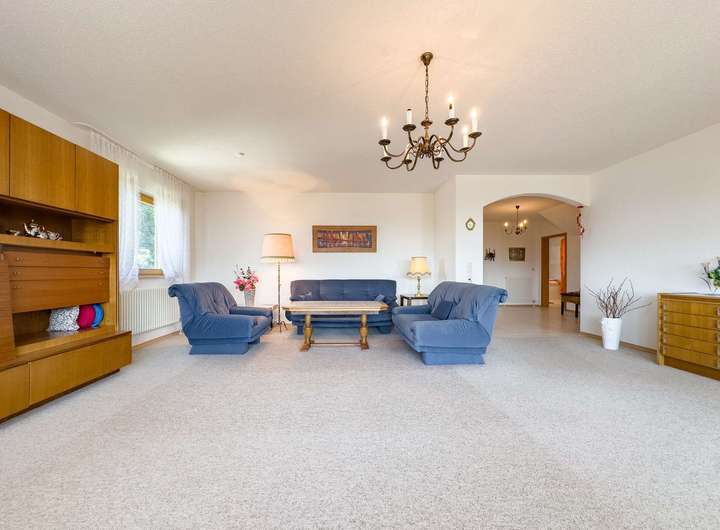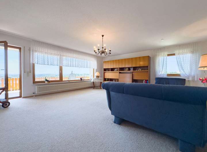 - großzügiges Wohnzimmer mit großer Fensterfront und Panoramablick