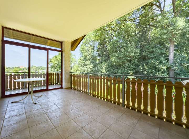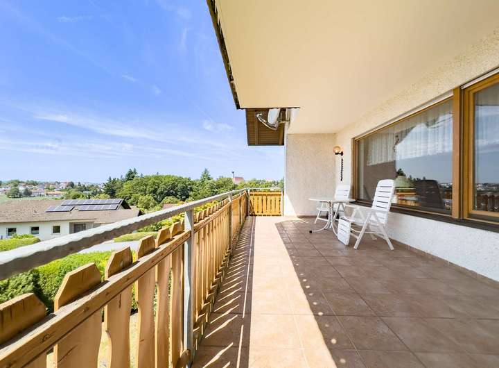 - große, überdachte Terrasse mit Blick bis in die Alpen (bei passendem Wetter)