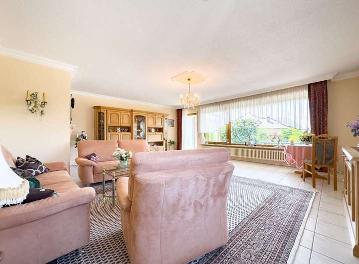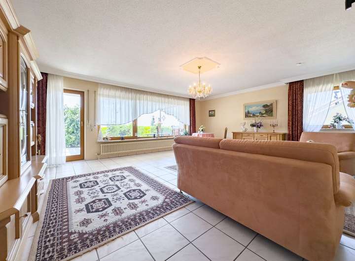 - großzügiges Wohnzimmer mit großer Fensterfront und schönem Blick in den Garten