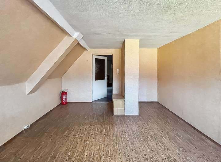 Das Obergeschoss verfügt über ein weiteres Wohnzimmer, eine Küche (Einbauküche aus ca. 2012), ein Badezimmer, ein Schlafzimmer, ein Arbeitszimmer sowie einen Abstellraum. Der vorhandene Kachelofen ist aktuell stillgelegt, kann jedoch mit einem neuen Einsatz wieder in Betrieb genommen werden. Die Fenster im Obergeschoss wurden ca. 1978 erneuert.