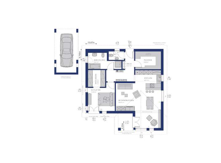 Diese Projektierung zeigt Ihnen eine Möglichkeit, die im Rahmen des Bebauungsplans zulässig ist. Gerne besprechen wir Ihren individuellen Wunsch bei einer Grundstücksbesichtigung vor Ort.