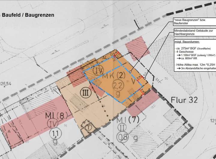 Für das Grundstück gilt ein Bebauungsplan. Laut Aussage des Architekten ist hier eine Mehrfamilienhausbebauung mit rund 800m² Fläche möglich!