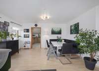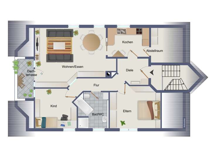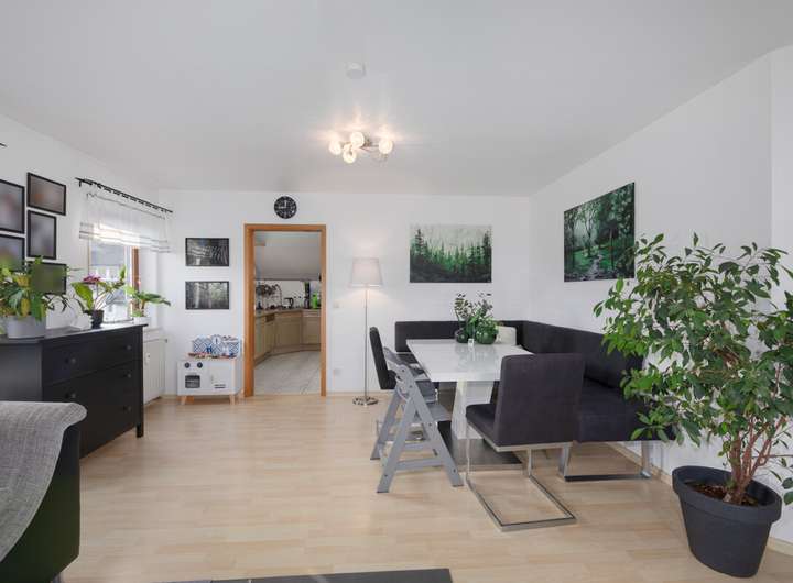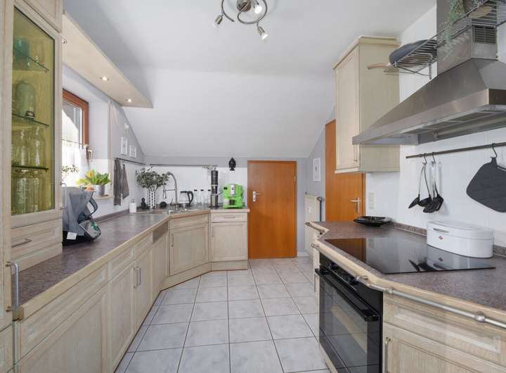 Der großzügige Wohn- und Essbereich bildet das Herzstück der Wohnung. Von hier aus gelangen Sie direkt auf die schöne Dachterrasse, die an sonnigen Tagen zum Entspannen oder gemeinsamen Frühstück im Freien einlädt. Die angrenzende Küche bietet genügend Platz zum Kochen und verfügt zusätzlich über einen praktischen Abstellraum, in dem Vorräte oder Haushaltsutensilien bequem verstaut werden können.