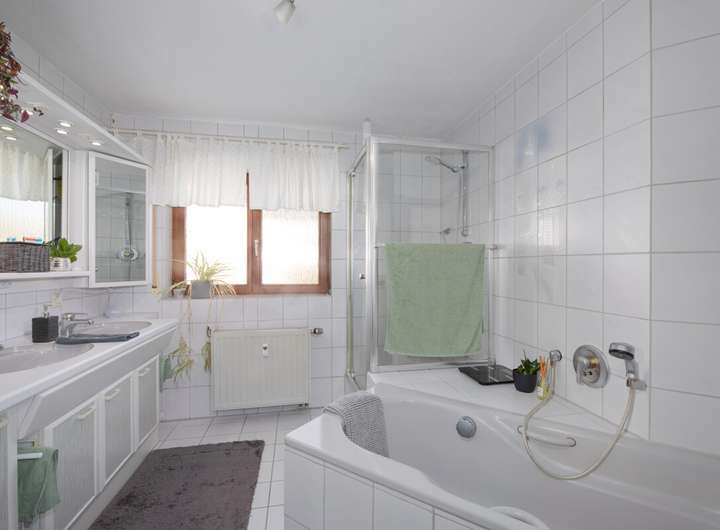 - Tageslichtbad mit einer Badewanne, Dusche und einem WC, Raumhochgefließt