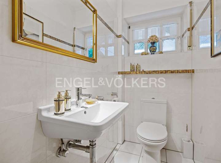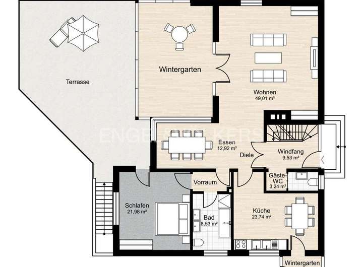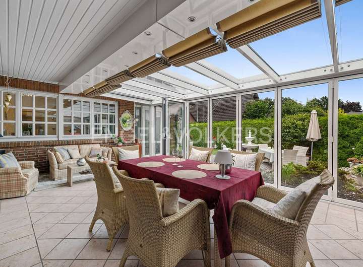 Nach Betreten des Hauses eröffnet sich der geräumige Flur mit Garderobenbereich. Im Erdgeschoss erwartet Sie ein großzügiger offener Wohn- und Essbereich sowie ein großzügiges Schlafzimmer mit Bad En Suit. Dem ca. 62 m² großen Wohn- und Essbereich schließt sich der lichtdurchflutete Wintergarten mit direktem Zugang zur Terrasse und dem Garten an. Die Wohnküche ist mit hochwertigen Einbaumöbeln und Geräten ausgestattet. Ein Gäste-WC befindet sich ebenfalls auf dieser Etage.