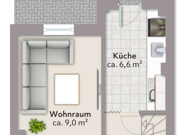 Im Erdgeschoss empfängt Sie ein praktischer Windfang, von dem aus Sie links in den großzügigen Wohn- und Essbereich gelangen. Geradeaus befindet sich die Küche, die einen direkten Zugang zum gepflasterten Innenhof bietet – ein geschützter Außenbereich, der zum Verweilen einlädt.