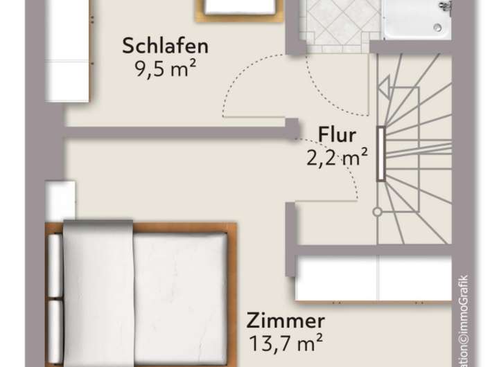 Über eine Vollholztreppe erreichen Sie das Obergeschoss. Hier stehen Ihnen zwei flexibel nutzbare Zimmer zur Verfügung, die sich bestens als Schlafzimmer, Kinder- oder Arbeitszimmer eignen. Ergänzt wird diese Etage durch ein Tageslichtbad mit Waschmaschinenanschluss.