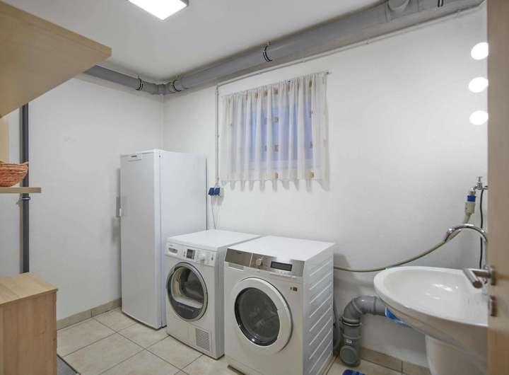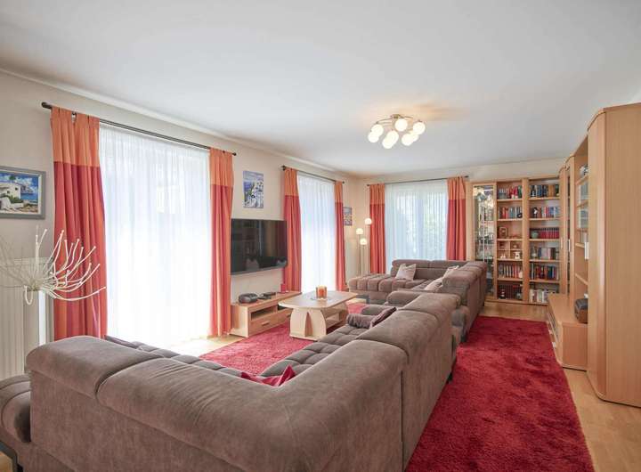 Zu den praktischen Merkmalen gehören eine Garage mit elektrischem Tor, zwei zusätzliche Außenstellplätze sowie außen und innen fest verbaute Fliegenschutzgitter an allen Fenstern – ideal für den Sommer.