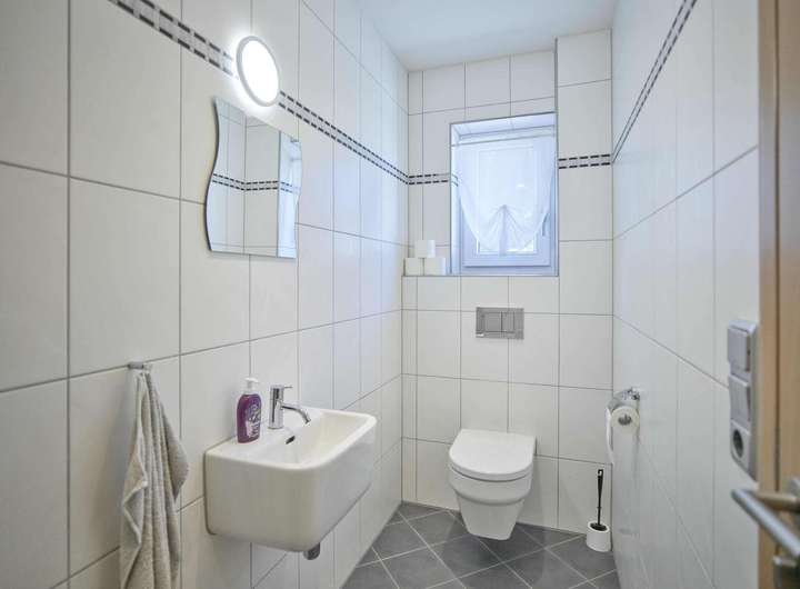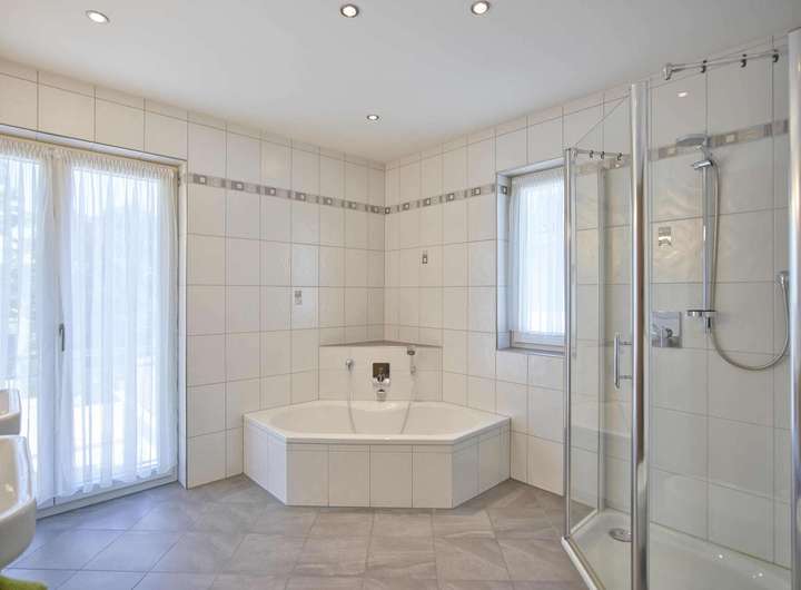 Das Haus ist effizient beheizbar durch eine Gaszentralheizung, die im Jahr 2023 erneuert wurde. Ergänzend dazu ist im oberen Bad eine Fußbodenheizung installiert. Die zwei separaten WCs – je eines im Erdgeschoss und im Obergeschoss – erlauben es, Bad und WC getrennt zu nutzen: das obere Badezimmer verfügt über Badewanne und separate Dusche, alle Sanitärräume sind mit Fußbodenheizung versehen.