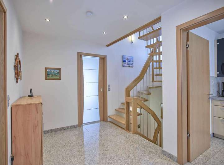 Der elegante Innenausbau besticht durch eine Vielzahl hochwertiger Bodenbeläge von Naturstein über Eichenparkett bis hin zu Teppich und modernen Fliesen. Die Einbauküche ist ein zusätzlicher Bonus, ebenso wie die bisher vorbereitete Planung für eine Kamininstallation im Wohnbereich.
