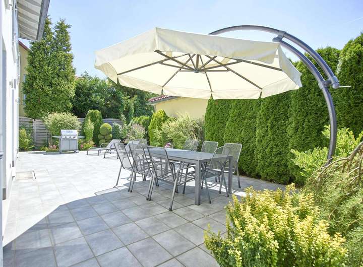 Rund ums Haus verläuft Granitpflaster, das nicht nur optisch überzeugt, sondern auch praktisch nutzbar ist. Der sonnige Garten auf der Südseite ist ein echtes Highlight: Bereits eingewachsen, liebevoll gepflegt und mit bestehendem Baumbestand versehen, bietet er ein idyllisches, grünes Refugium – ganz ohne weiteren Aufwand. Hier können Familien und Gartenfreunde sofort entspannen und das naturnahe Wohngefühl genießen. Ein charmantes Holz-Gartenhaus ergänzt den Außenbereich funktional und dekorativ.