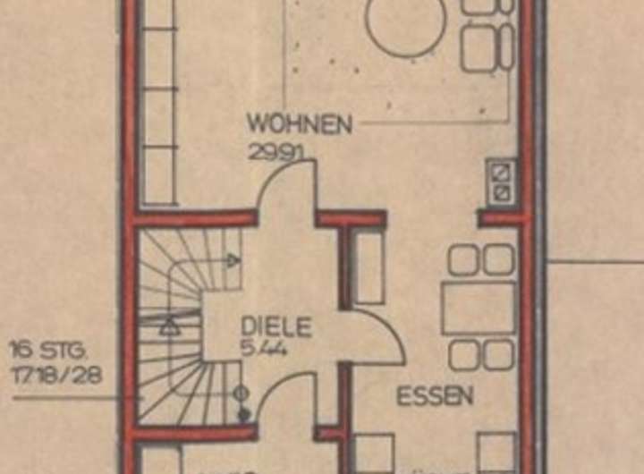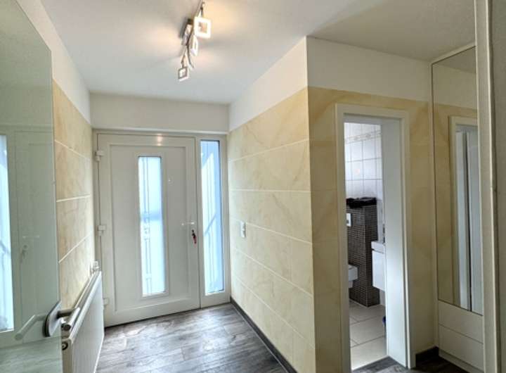 Ein wahrer Tiefstapler. Das super gepflegte Haus ist beidseitig angebaut und steht gut da. Die Eingangstür und das edle Edelstahlgeländer deuten die Ausstattung für den Kenner schon an. Das 1979 gebaute, heute wie ein Reihenmittelhaus zu wertende Gebäude hat einen sehr schönen Garten nach hinten, wo sich Felder Richtung Nordwesten anschließen.