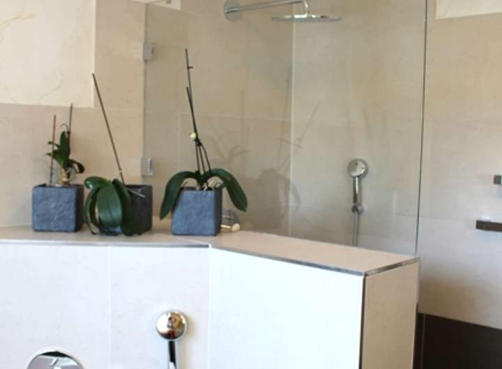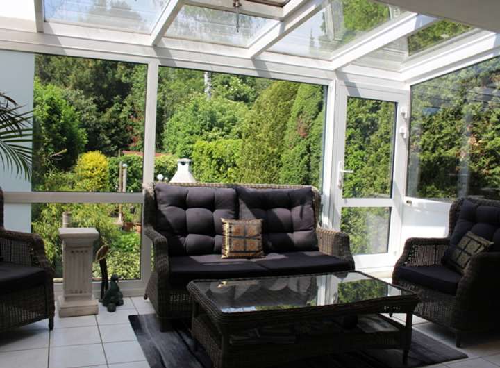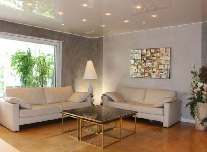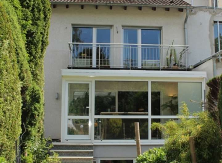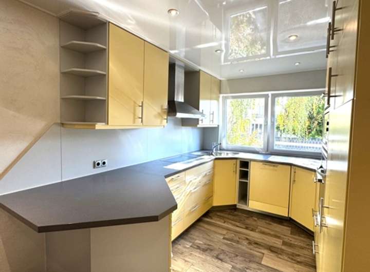 Im EG ist durchgängig eine weiße Lackspanndecke mit integrierter Beleuchtung. Die Einbauküche ist zum Wohnraum offen. Der geräumige Wintergarten mit Plissee-Jalousien schützt gegen die Sonne.
