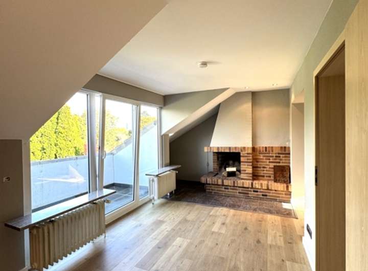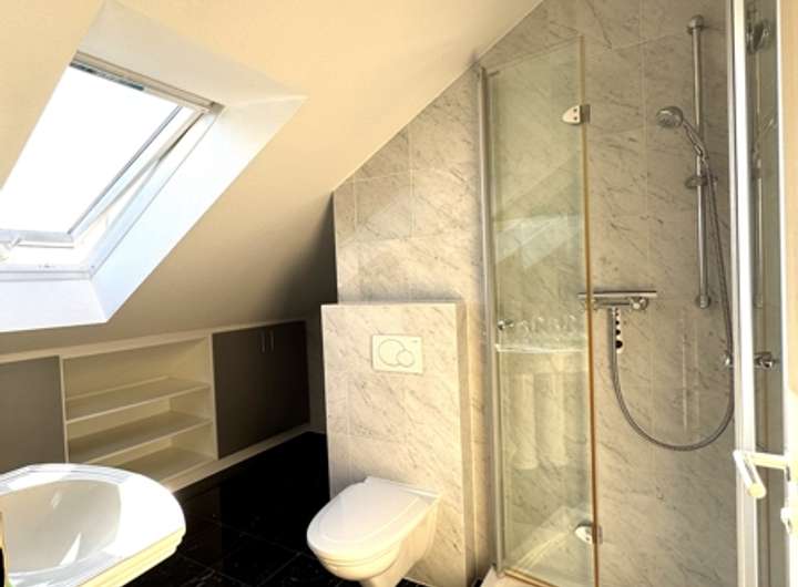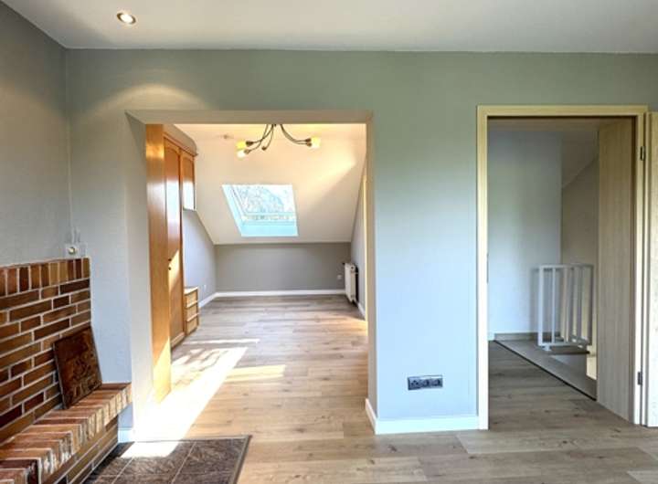 Das Studio im DG, mit Duschbad & Dachloggia war der Rückzugsort des vorherigen Eigentümers, wo man ruhige Stunden am Kamin verbringen kann.