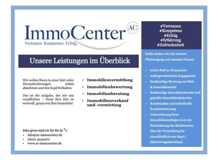 Terminvereinbarungen via info@ac-immocenter.de oder 061013041470 bzw. 0163 4573743. Weitere Immobilienangebote können Sie sich gerne unter www.ac-immocenter.de ansehen.