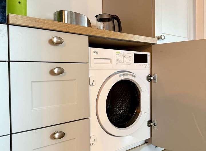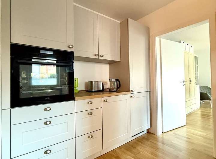 - Einbauküche: Die topmoderne Einbauküche aus 2023 ist mit Markengeräten ausgestattet und verfügt über einen Backofen mit Garfunktion, Kühl-/ Gefrierkombi, Geschirrspüler und einen Waschtrockner.