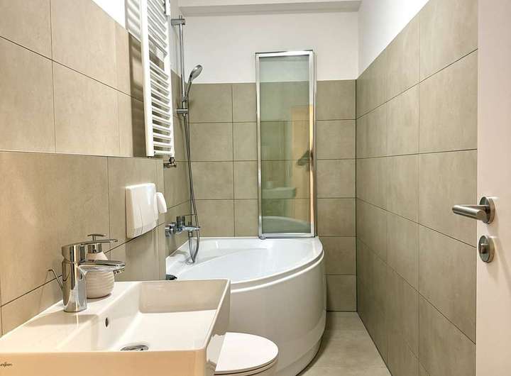 - Badezimmer: Genießen Sie das 2023 stilvoll gestaltete Badezimmer mit ausgesuchten und zeitlosen Materialien. Ein Fenster ist in Abstimmung mit der Hausgemeinschaft denkbar.