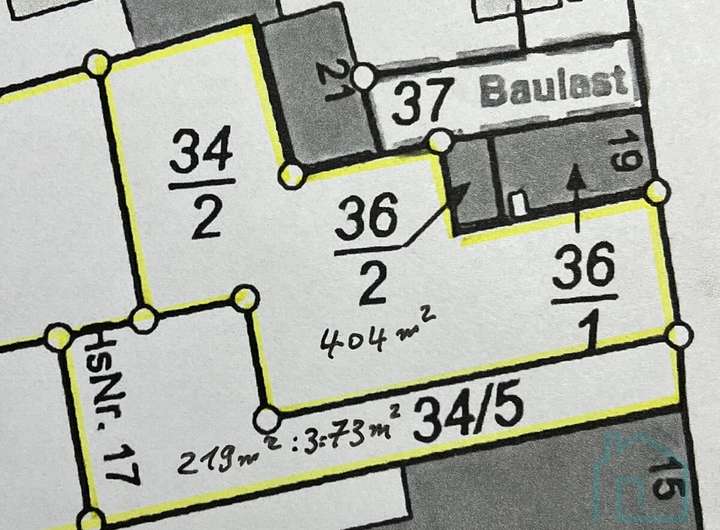 Der Bauplatz ist teilerschlossen und hat eine Größe von 405 m² zzgl. 1/3 der Zufahrt und des Wendehammers (73 m²), also insgesamt 473 m² (Straßenseite mit erlaubter Grenzbebauung).