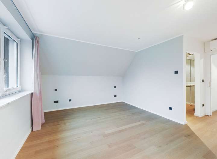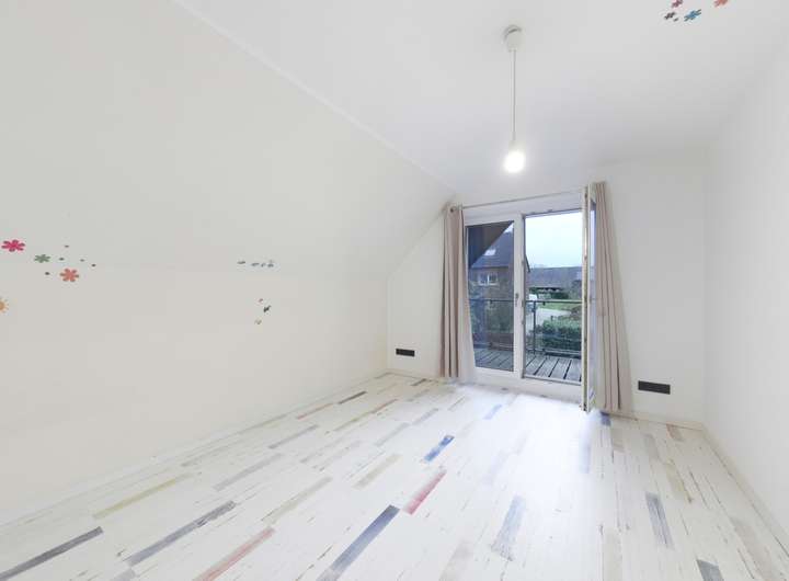 Im Obergeschoss befinden sich die privaten Rückzugsorte: Zwei Kinderzimmer, ein großzügiges Schlafzimmer mit Ankleidezimmer und ein stilvolles Badezimmer, das keine Wünsche offenlässt. Der Balkon lädt dazu ein, den Tag mit einem Kaffee in der Morgensonne zu beginnen.