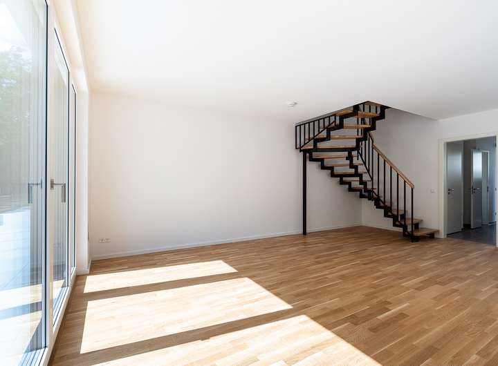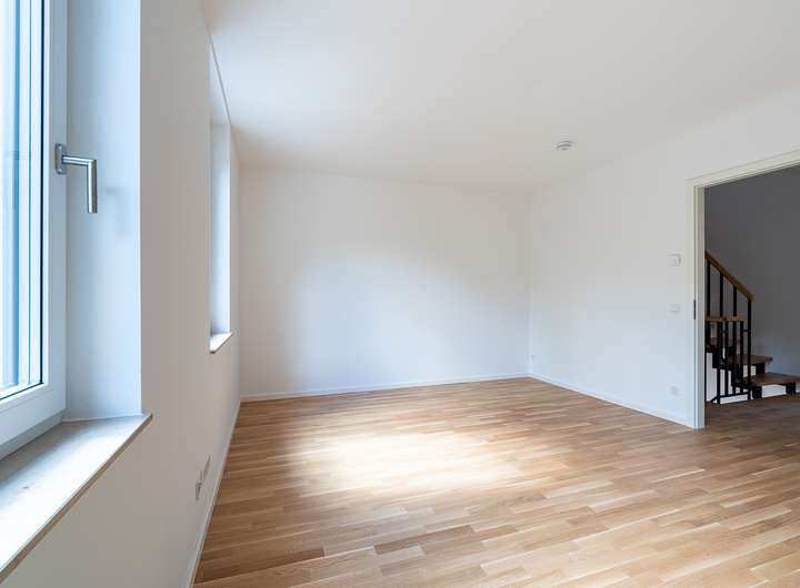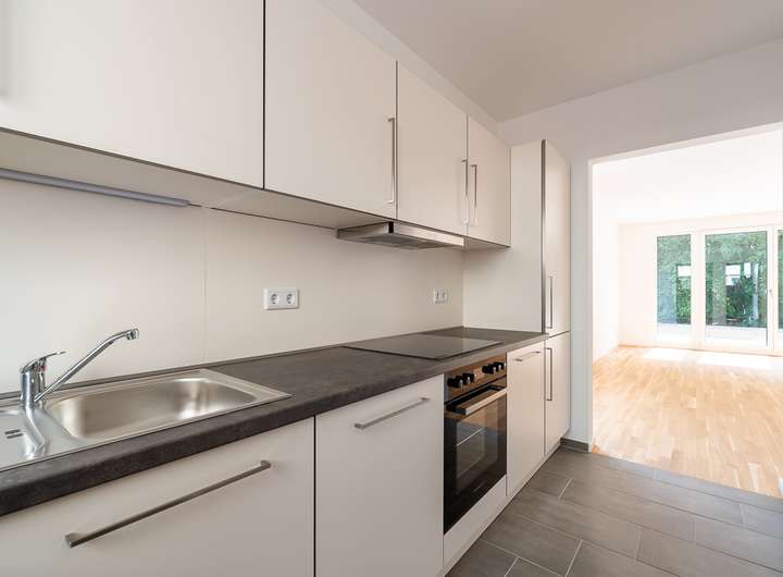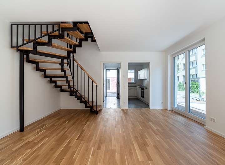 Die Remise bietet mit ihren 4 Zimmern auf 3 Etagen eine aufgeschlossene Wohnatmosphäre, die durch eine offene Konstruktion der großzügigen Terrasse und zum angrenzenden Mietergarten bekräftigt wird.