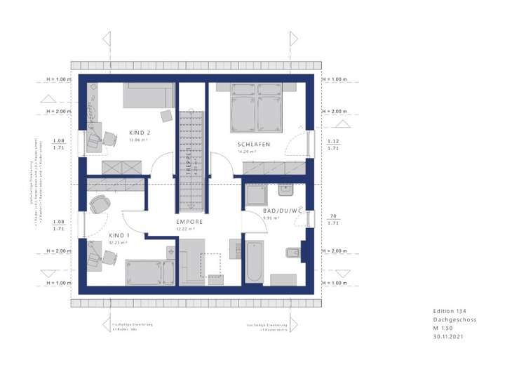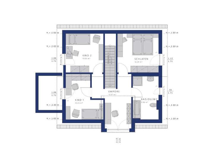 Alles in bester Ordnung ist auch oben. Eine kuschelige Empore erschließt hier drei Zimmer für die Eltern und zwei Kinder,