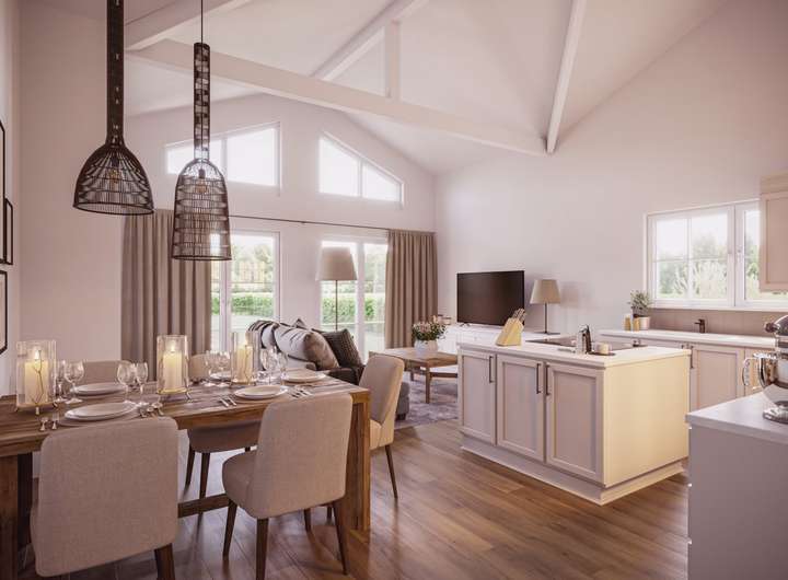 Beim Betreten des Bungalows werden Sie sofort die einladende und warme Atmosphäre spüren. Der großzügige Wohnbereich ist perfekt für gemeinsame Familienabende und bietet viel Platz zum Entspannen und Spielen. Große Fenster sorgen für eine helle und freundliche Wohnatmosphäre und bieten einen herrlichen Blick auf den grünen Garten.
