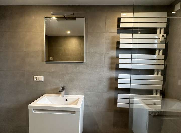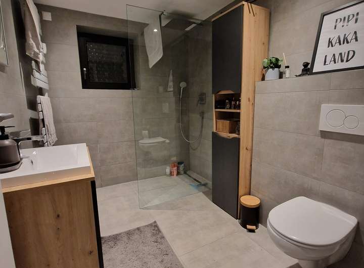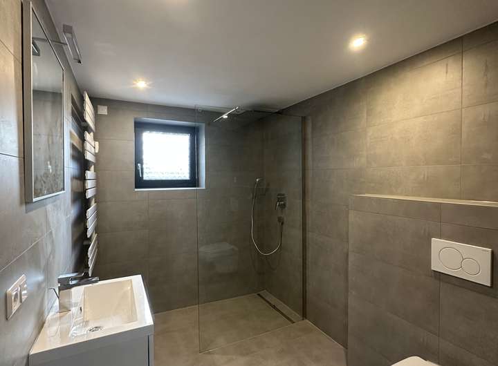 Das Badezimmer verfügt über eine große begehbare Dusche.