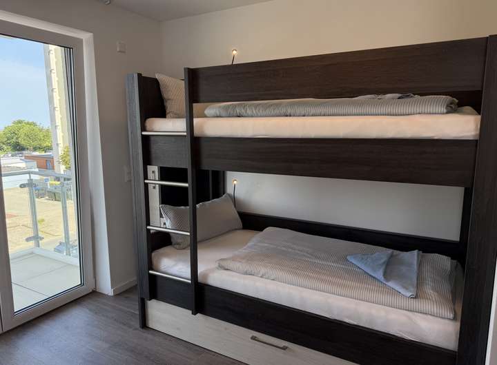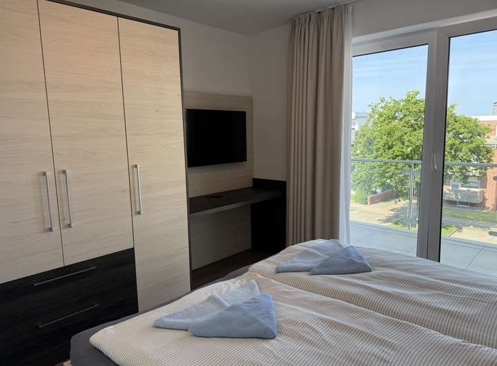 Die Wohnung verfügt über zwei komfortable Schlafzimmer. Das Hauptschlafzimmer ist mit einem hochwertigen Doppelbett, einem großzügigen Kleiderschrank, einem Schreibtisch sowie einem Fernseher ausgestattet. Das zweite Schlafzimmer bietet dank eines praktischen Hochbetts mit zwei Schlafplätzen, einem Kleiderschrank und einem Schreibtisch vielseitige Nutzungsmöglichkeiten - ob als Kinder-, Gäste- oder Arbeitszimmer. Beide Schlafzimmer verfügen über einen direkten Zugang zu dem geräumigen Westbalkon, auf dem Sie die Abendsonne genießen können.