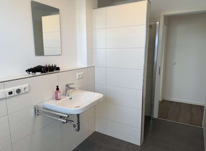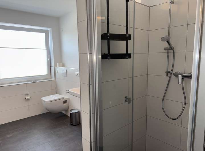 Das moderne Tageslichtbad ist hochwertig gefliest und mit einer bodentiefen Dusche, einem Handtuchheizkörper sowie eleganten Armaturen ausgestattet. Hier trifft Funktionalität auf stilvolles Design, sodass Sie sich jeden Tag aufs Neue wohlfühlen können.