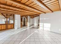 Der Essbereich fügt sich harmonisch in den offenen Grundriss ein und ist durch stilvolles Gebälk optisch vom Wohnraum getrennt. Die geschlossene Küche liegt direkt nebenan und überzeugt durch ihre praktische Aufteilung. Eine angrenzende Speisekammer bietet zusätzlichen Stauraum und erleichtert den Alltag.