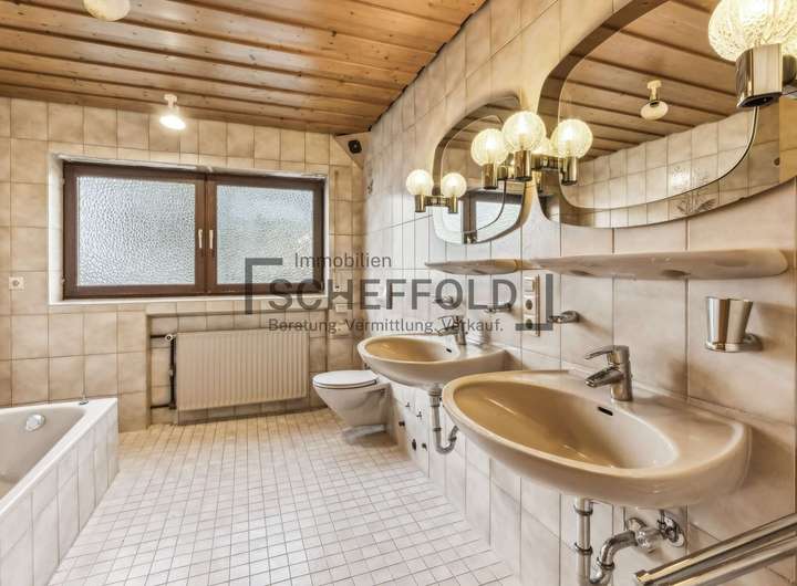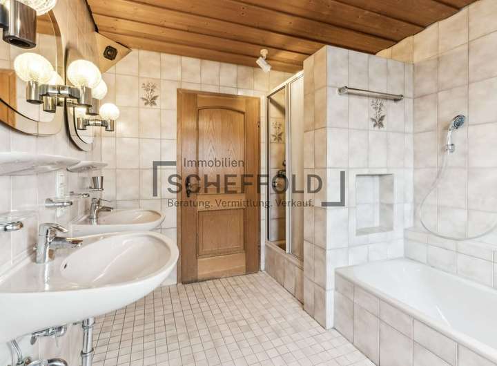 Mittelfristig bietet sich eine Modernisierung der Innentüren und Zargen an, um dem Wohnraum ein einheitliches, frisches Erscheinungsbild zu verleihen. Auch eine Modernisierung des Badezimmers sowie des Gäste-WCs kann das Wohnambiente deutlich aufwerten und an heutige Ansprüche anpassen.