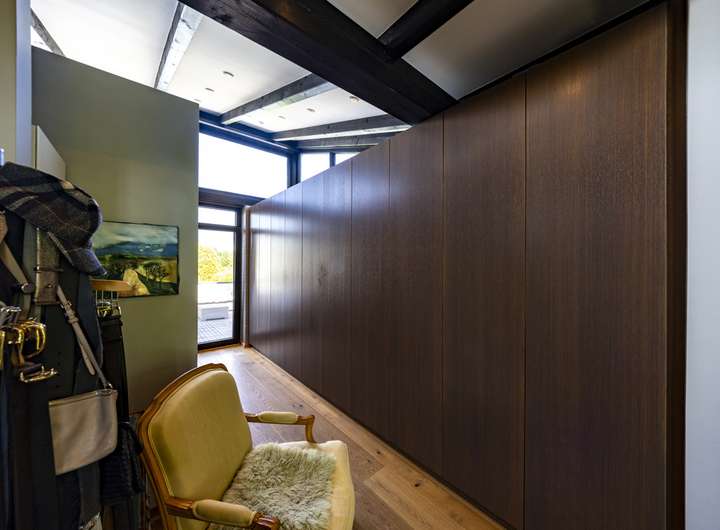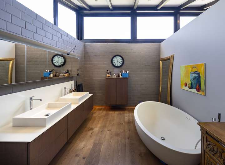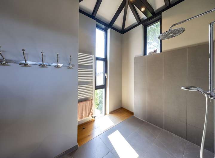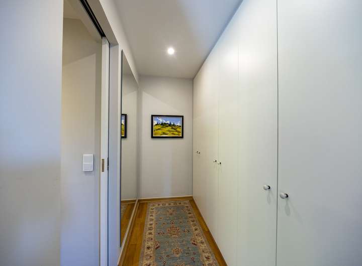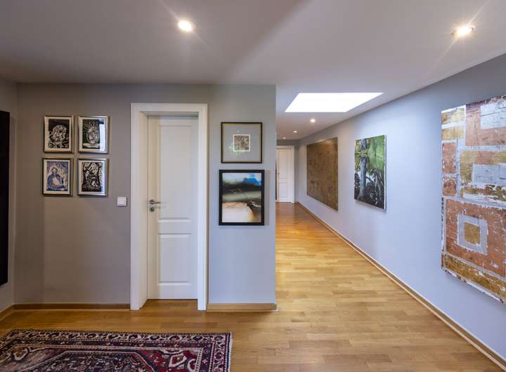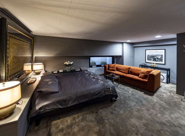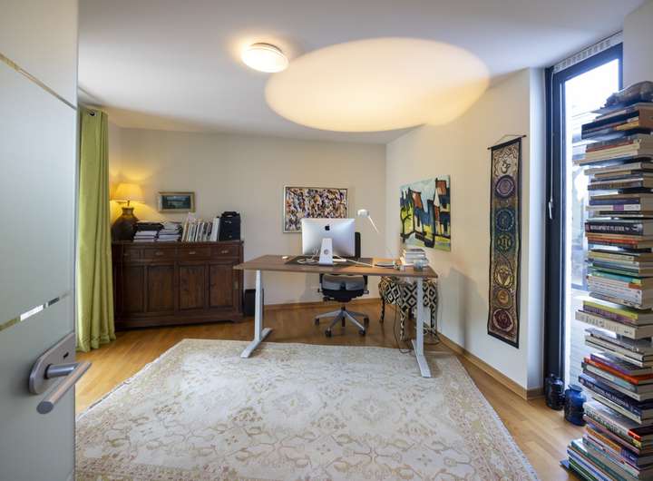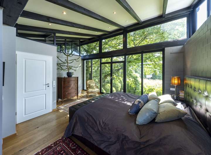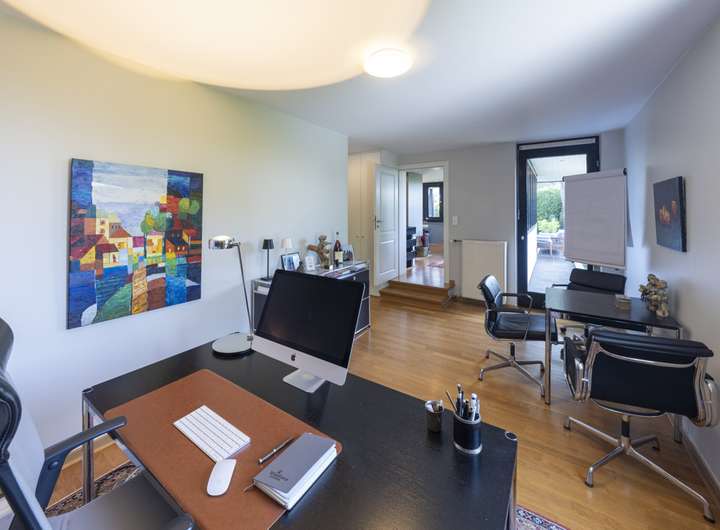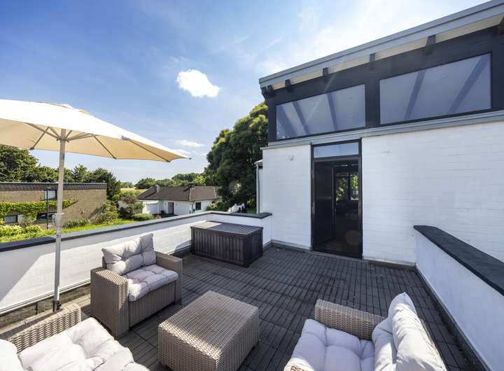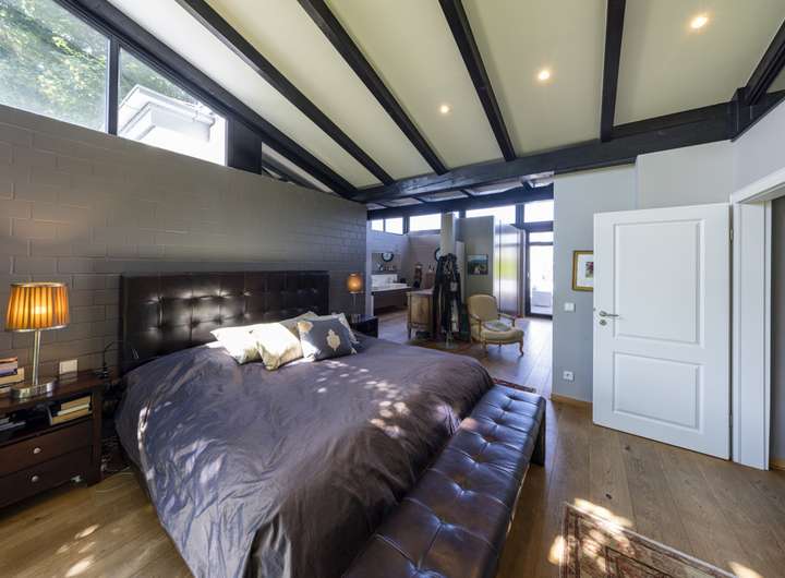 Mitte der 1990er-Jahre wurde das lichtdurchflutete Haus um einen seitlich gelegenen Gebäudeteil erweitert, der 2011 von den jetzigen Eigentümern umfassend modernisiert wurde. Hier entstand ein stilvoller Wohn- und Medienbereich mit großflächiger Verglasung und direktem Zugang zum Dachgeschoss. Das ehemalige Atelier wurde zu einem offen gestalteten Masterbereich mit luxuriöser Hotel-Suiten-Atmosphäre umgebaut. Der Schlafbereich geht fließend in eine komfortable Ankleide mit maßgefertigtem Einbauschrank über. Von hier aus betritt man eine großzügige Dachterrasse mit herrlichem Fernblick – ideal zum Entspannen. Ein hochwertig ausgestattetes Bad mit freistehender Wanne, Walk-in-Dusche, Doppelwaschtisch und separater Toilette rundet diesen privaten Rückzugsbereich ab.