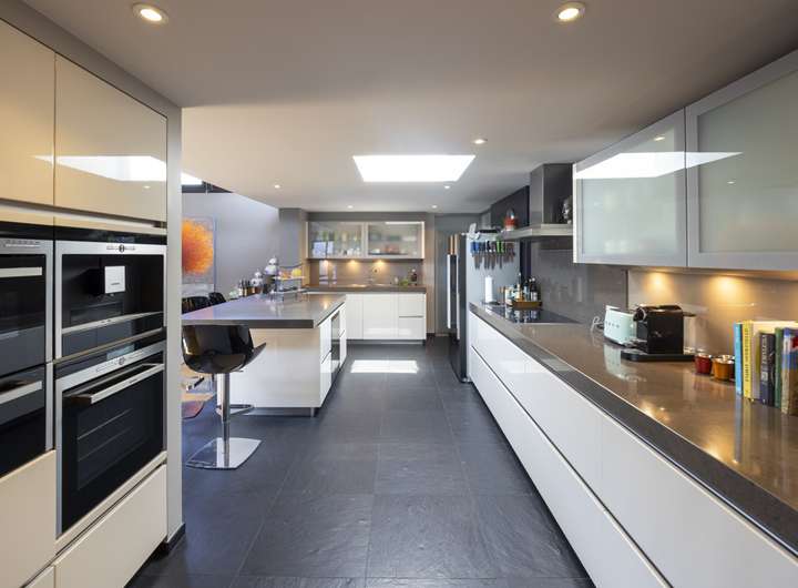 Die moderne Küche mit champagnerfarbenen Hochglanzfronten, Marken-Elektrogeräten und zentraler Kochinsel samt Barbereich erfüllt höchste Ansprüche – ein Genussort für Hobbyköche und Gäste zugleich.