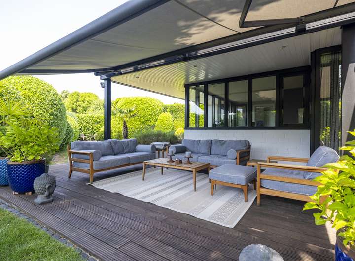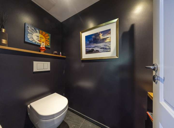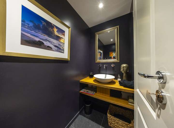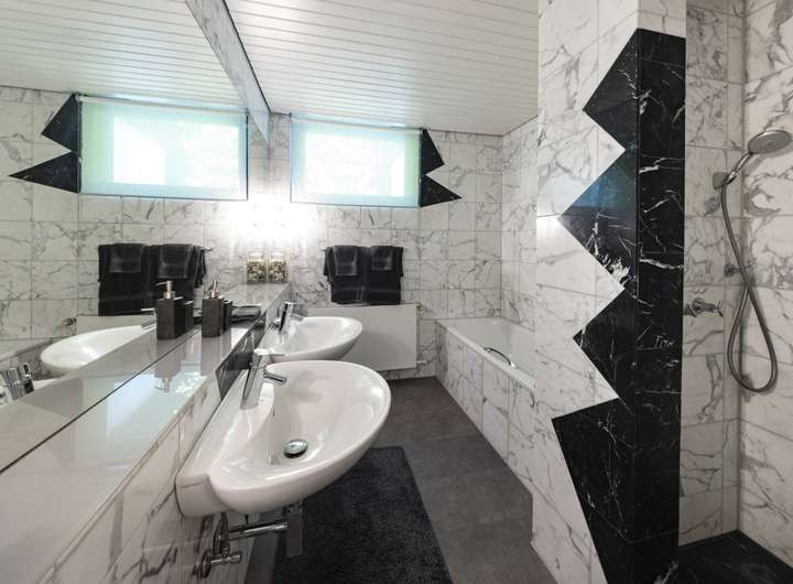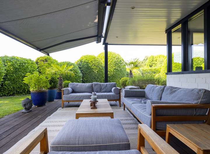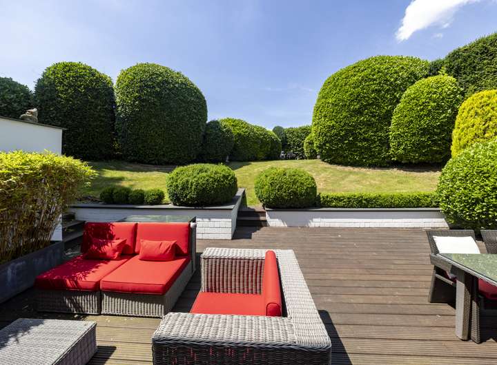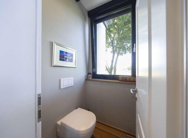 Das Erdgeschoss bietet darüber hinaus ein weiteres Zimmer mit en suite Duschbad im Stil des Baujahrs. Dank bodentiefer Fenster ist dieser Raum hell und freundlich – perfekt als Kinder- oder Gästezimmer. Zusätzlich gelangt man vom Wohnbereich in einen separaten Gästetrakt, der aktuell als Arbeitsbereich mit Blick ins Grüne genutzt wird. Auch hier stehen ein elegantes Marmorbad mit Dusche, Wanne, Doppelwaschbecken und separater Toilette sowie ein raumhoher Einbauschrank zur Verfügung. Ein direkter Zugang zu einer der drei Bangkirai-Terrassen schafft fließende Übergänge ins Freie – ideal für sonnige Stunden oder entspannte Abende im Schatten der elektrisch betriebenen Markisen.
