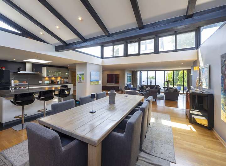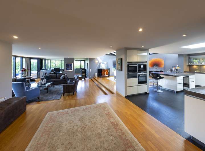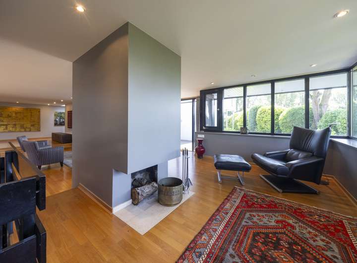 In den 1980er-Jahren wurde der einstige Innenhof überdacht und als Wohnfläche integriert. Heute bildet dieser Bereich den stilvollen Essplatz – offen verbunden mit der hochwertigen Einbauküche und dem weitläufigen Wohnzimmer. Diese fließende Raumkomposition im Split-Level-Design beeindruckt durch ihre Großzügigkeit, die bodentiefen Fenster und den Ausblick auf das liebevoll angelegte, uneinsehbare Grundstück, das seitlich und rückwärtig an Felder und Wiesen grenzt – ein idyllischer Ort der Ruhe und naturnahen Geborgenheit.