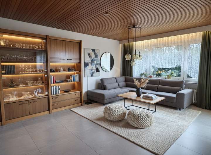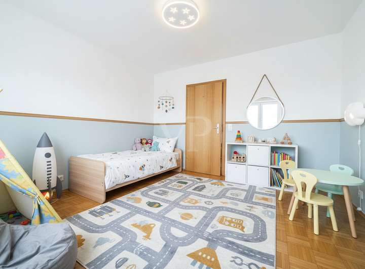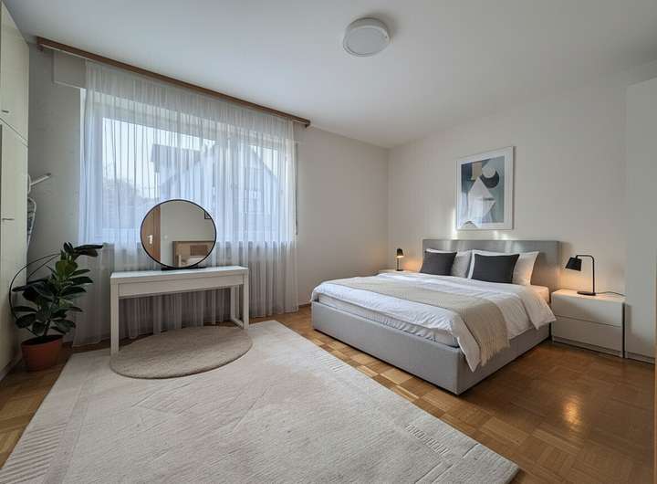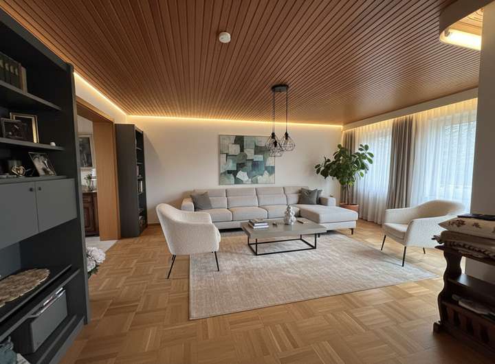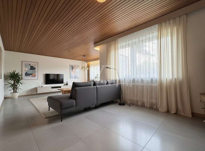 Die Gesamtwohnfläche von ca. 167 m² verteilt sich auf die Hauptwohnung im Erdgeschoss und die vollständig abgetrennte Einliegerwohnung mit ca. 58 m² im Untergeschoss. Die Hauptwohnung ist ab sofort bezugsfrei und überzeugt durch einen funktionalen Grundriss mit Schlafzimmer, Kinderzimmer, Tageslichtbad, Küche, Esszimmer und einem hellen Wohnzimmer mit Zugang zum Balkon. Eine große seitliche Terrasse erweitert den Wohnkomfort nach draußen und schafft zusätzliche Aufenthaltsqualität.