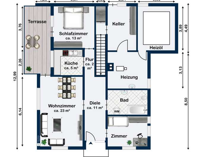 Die Einliegerwohnung im Untergeschoss umfasst Wohnzimmer, Kinderzimmer, Elternzimmer, Küche, Bad, Flur und eine eigene Terrasse. Sie ist derzeit vermietet, weshalb momentan keine Innenaufnahmen zur Verfügung stehen – ein Vorteil für Kapitalanleger. Ein zusätzlicher Kellerraum sorgt für praktischen Stauraum.