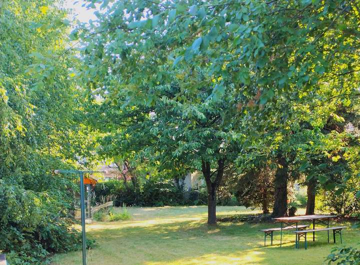 Das Grundstück hat eine Breite von ca. 20 m, eine mittlere Tiefe von ca. 50 m und grenzt am Ende des großen Gartens an eine benachbarte Wohnstraße. Der großzügige Garten verfügt über alten Baumbestand.