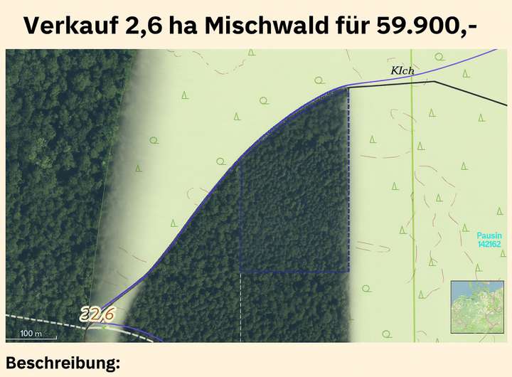 Zum Verkauf steht ein ca. 25.813 m² großes Waldgrundstück im Ortsteil Pausin, Gemeinde Schönwalde-Glien, Landkreis Havelland (Brandenburg). Die Fläche ist im Grundbuch eingetragen und befindet sich in Privatbesitz. Es handelt sich um Mischwald mit Laub- und Nadelgehölzen.