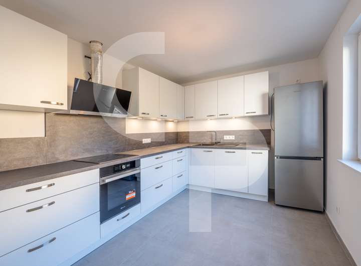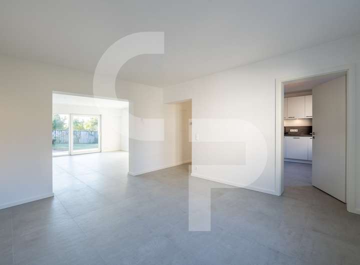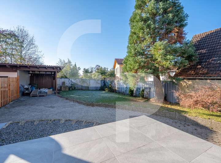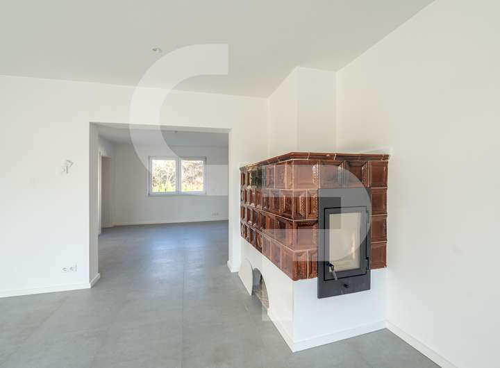 Im Erdgeschoss erwartet Sie eine moderne Einbauküche mit hochwertigen Elektrogeräten, angrenzend an ein helles Esszimmer und ein besonders lichtdurchflutetes Wohnzimmer. Ein Kachelofen sorgt hier für gemütliche Stunden in der kalten Jahreszeit. Von der gefliesten Terrasse gelangen Sie direkt in den Garten, der sich ideal zur Erholung und für Familienaktivitäten eignet.